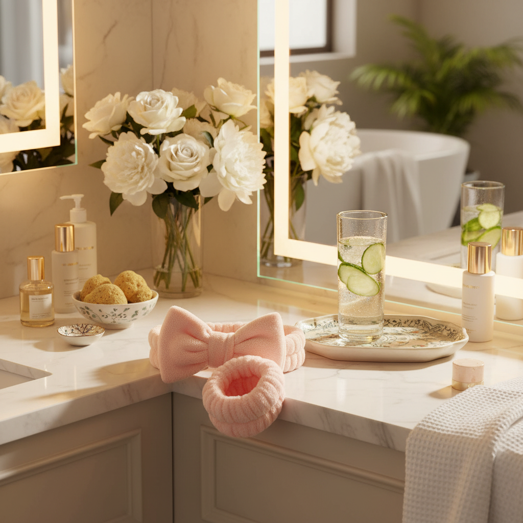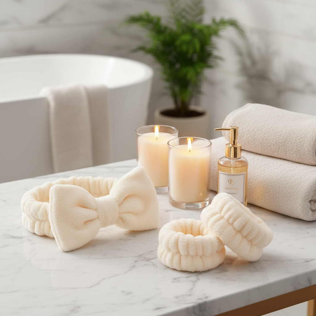 Transform your daily routine with our Spa headband and wristbands. No more drips, No more mess. Stay dry, comfortable, and feel the ease of a spa-like experience everyday.